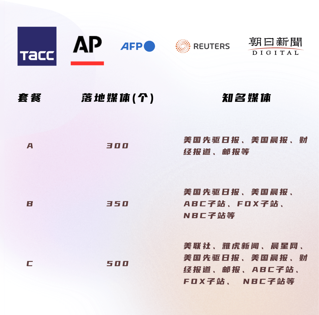 · 涵盖美联社、路透社、法新社、俄塔社、朝日新闻等在内的多家全球主流媒体的内容投放